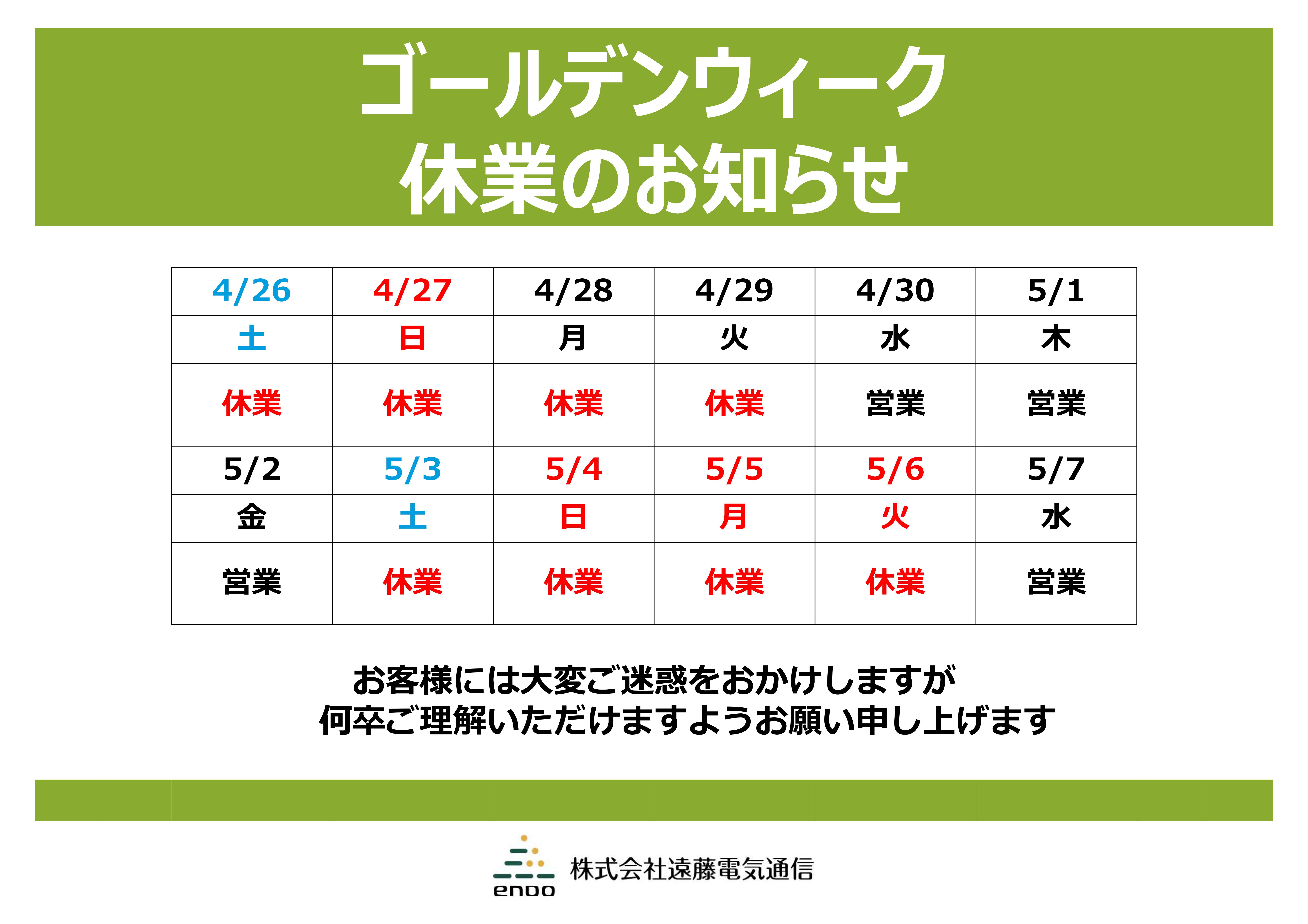 | 2025/04/25 | ゴールデンウィーク休業日のお知らせ |