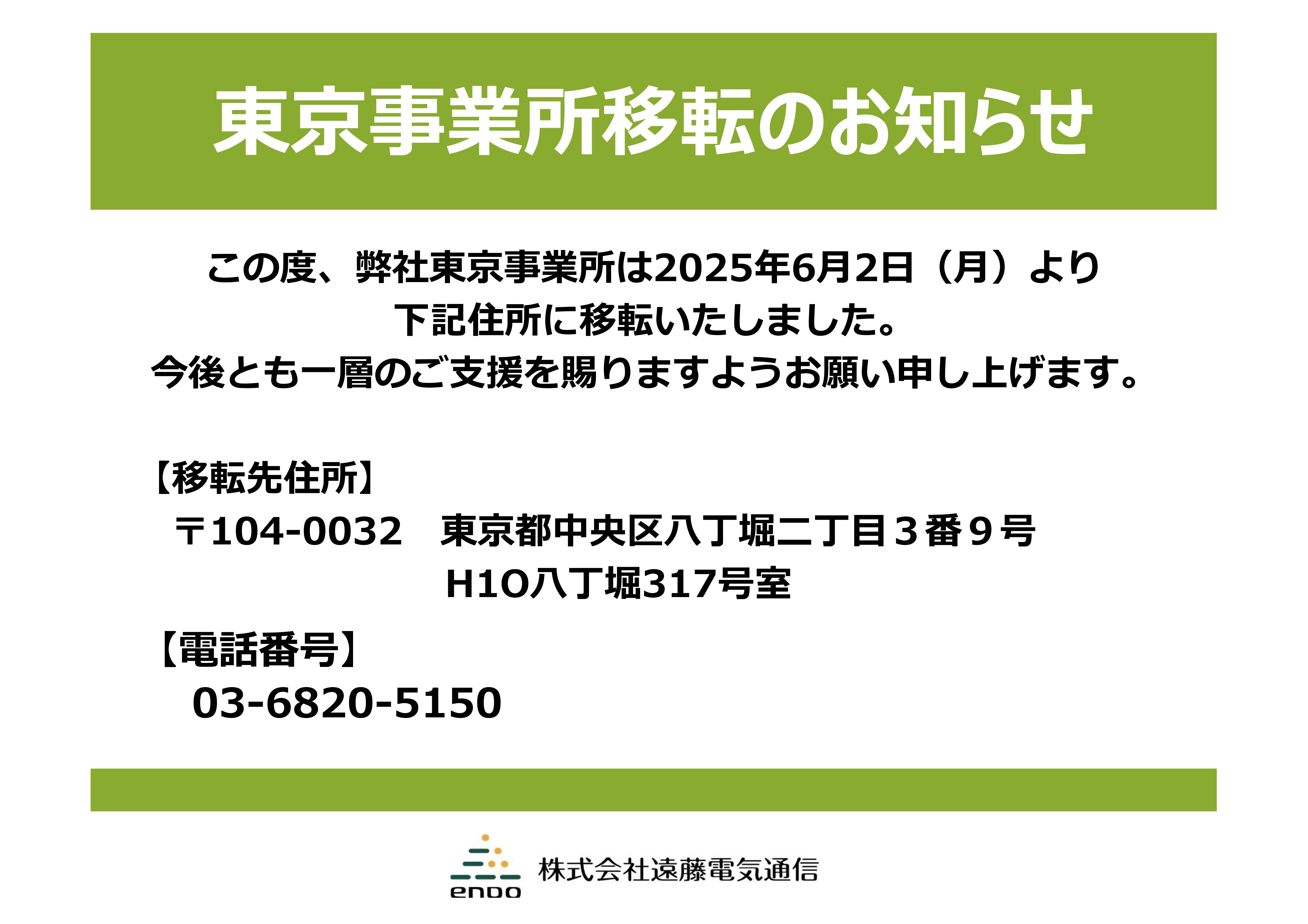 | 2025/06/09 | 東京事業所移転のお知らせ |